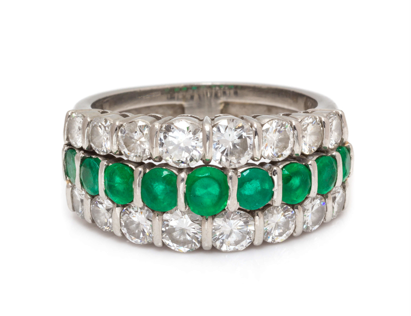 containing 16 round brilliant cut diamonds weighing approximately 1.45 carats total and nine round mixed cut emeralds measuring approximately 2.84-3.78 mm in diameter.