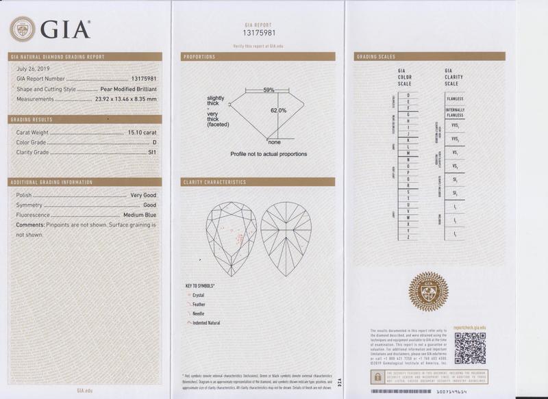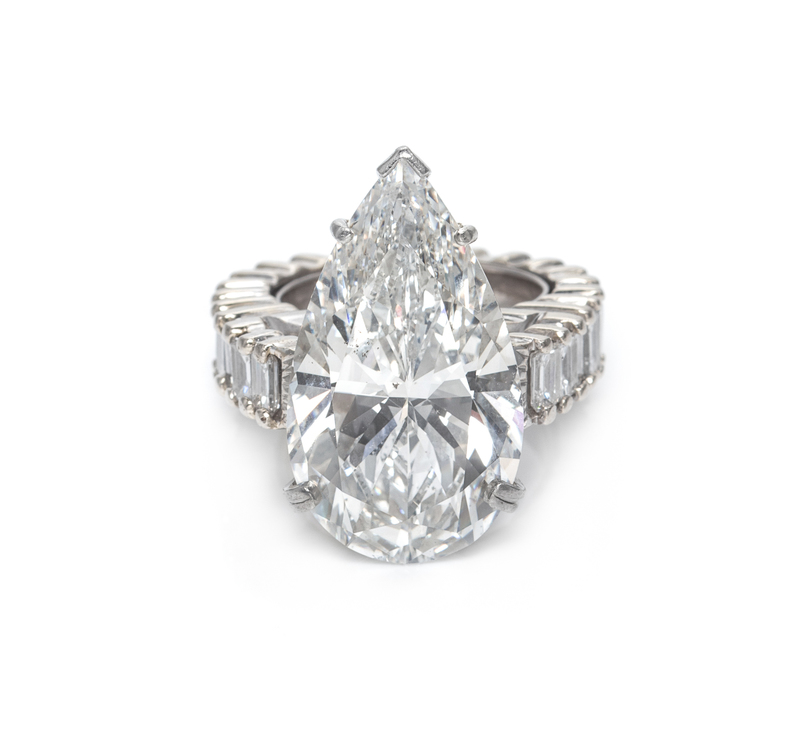 containing one pear shape brilliant cut diamond weighing 15.10 carats and 23 octagonal cut diamonds weighing approximately 4.00 carats total.