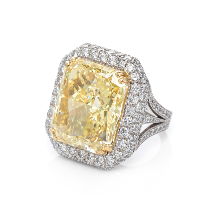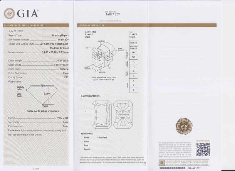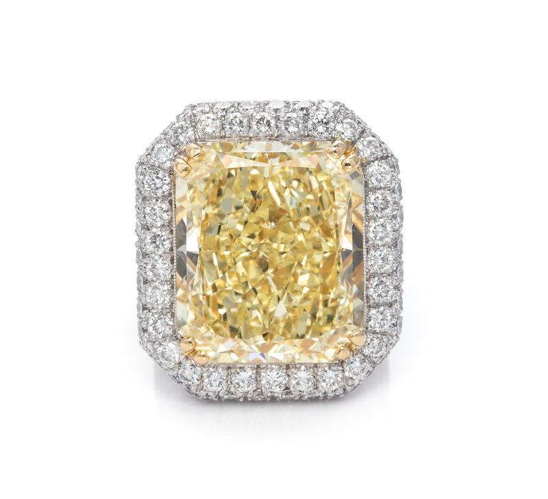 containing one radiant cut fancy yellow diamond weighing 27.64 carats and numerous round brilliant cut diamonds.