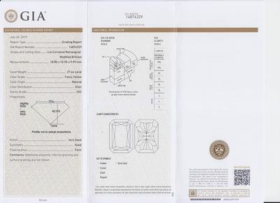 Accompanied by a Gemological Institute of America diamond grading certificate, number 14874329, dated July 26, 2019, stating Color: Natural, Fancy Yellow, Even, Clarity: VS2, Polish: Very Good, Symmetry: Good, Fluorescence: Faint.