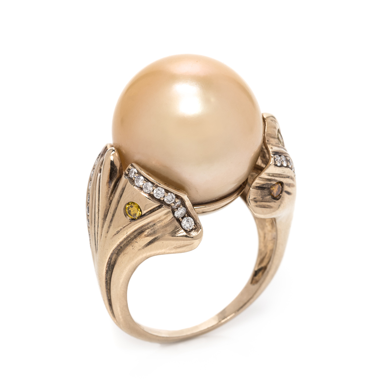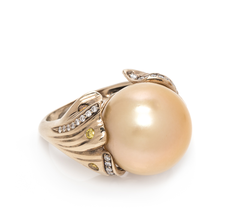 An 18 Karat Yellow Gold, Cultured Golden South Sea Pearl, Diamond and Colored Diamond Ring,
