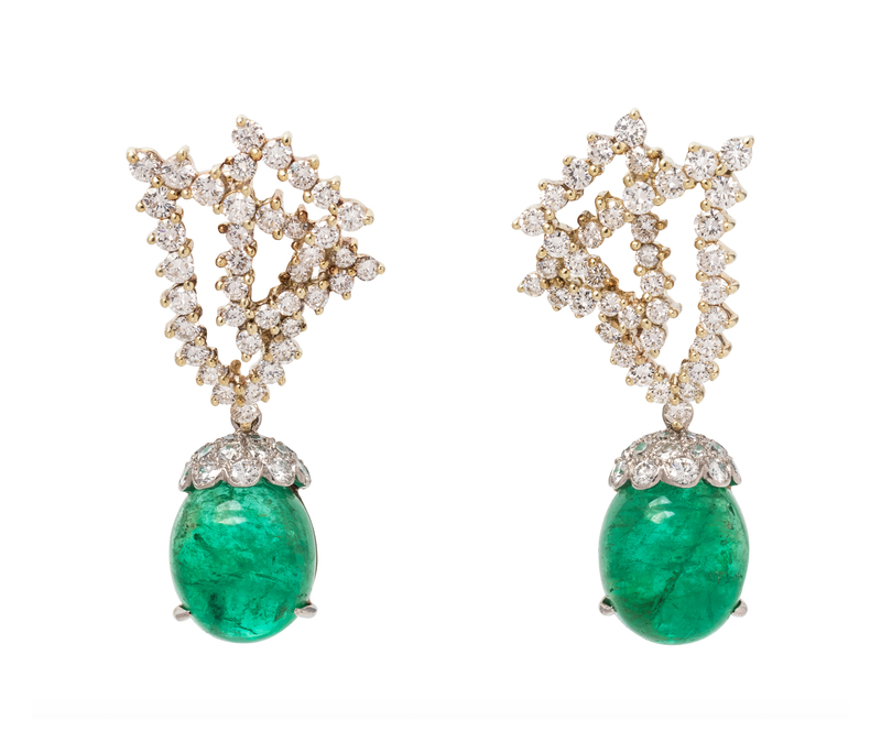 containing 130 round brilliant and single cut diamonds weighing approximately 3.75 carats total and two oval shape cabochon cut emeralds measuring approximately 13.70 x 11.70 x 8.10 mm, posts with clip backs, with later removable drops.