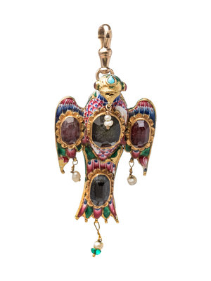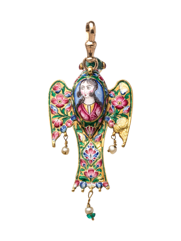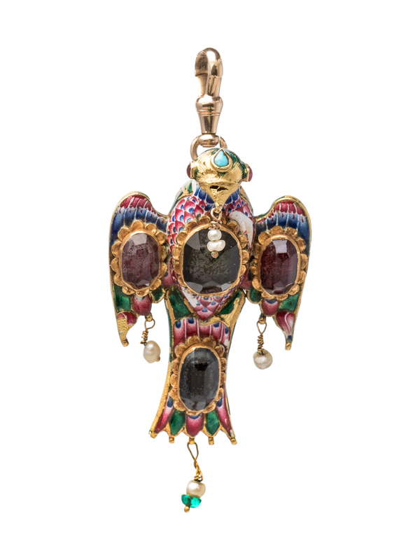 A High Karat Yellow Gold, Polychrome Enamel, Emerald, Turquoise, Cultured Pearl and Foilback Gemstone Bird Pendant, Qajar,