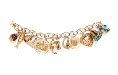 including a gold tone evil eye glass charm, an 18 karat gold and multigem bell motif charm, a 14 karat gold heart charm, a yellow gold good luck charm, a 14 karat gold "YOU ARE ALWAYS IN MY HEART" charm, an 18 karat Roman Colosseum charm, an 18 karat gold gondola charm, an 18 karat pillar monument charm, a Greek Parthenon charm with Greek key border, a 14 karat gold and multigem charm, an 18 karat gold articulated fish charm, together with an 18 karat gold wine jug charm.