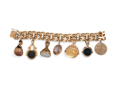A 14 Karat Yellow Gold Bracelet With Seven Attached Fobs and Charms,