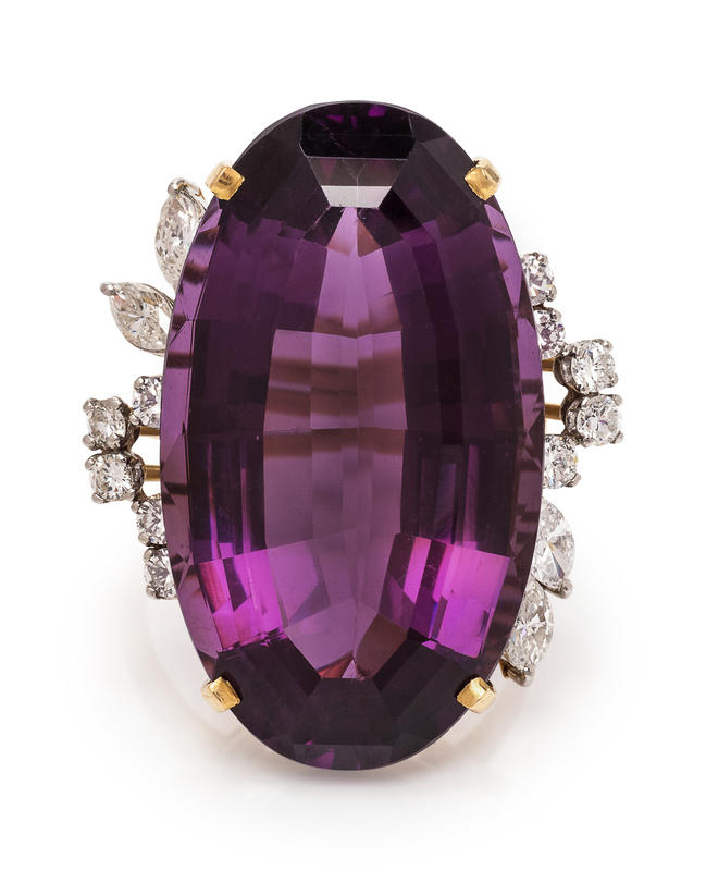 containing one oval step cut amethyst measuring approximately 31.70 x 18.20 x 11.90 mm, four marquise cut diamonds and 10 round brilliant cut diamonds weighing approximately 0.90 carat total.