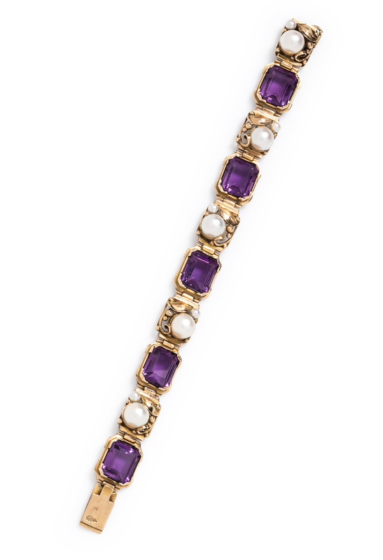 An Arts and Craft Yellow Gold, Amethyst and Pearl Bracelet, Edward Oakes,