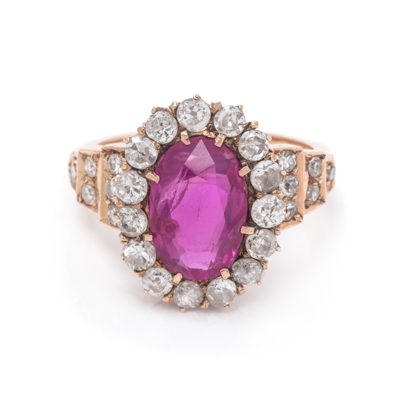 containing one oval mixed cut ruby measuring approximately 10.47 x 7.02 x 3.70 mm and 27 old European and single cut diamonds weighing approximately 0.75 carat total.
