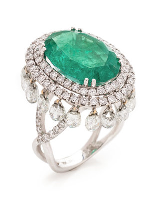 containing one oval cut emerald weighing approximately measuring approximately 16.90 x 11.75 x 6.55 mm, 92 round brilliant cut diamonds weighing approximately 1.50 carats total and 20 briolette cut diamonds weighing approximately 2.50 carats total.
