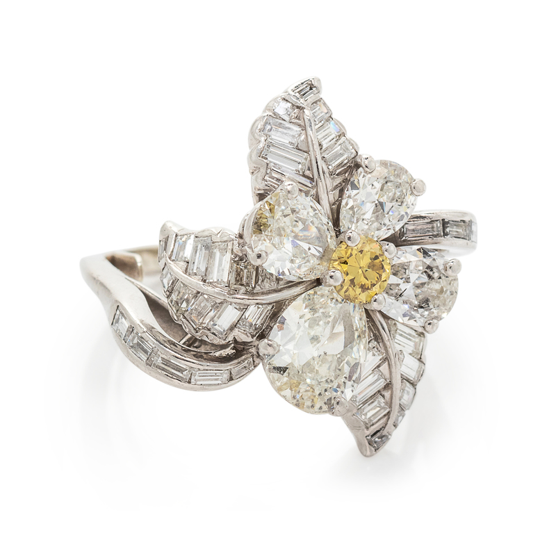 containing one round brilliant cut yellow diamond (origin of color not tested) weighing approximately 0.20 carat, four pear shape brilliant cut diamonds weighing approximately 2.25 carats total and numerous baguettes weighing approximately 2.85 carats total.