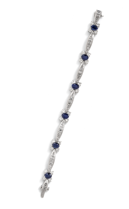 containing six oval mixed cut sapphires measuring approximately 6.20 x 5.00 mm, 24 round brilliant cut diamonds weighing approximately 2.00 carats total and 54 baguette cut diamonds weighing approximately 3.00 carats total.