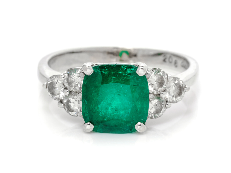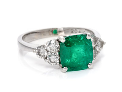 containing one cushion mixed cut emerald measuring approximately 9.35 x 8.80 x 6.15 mm and six round brilliant cut diamonds weighing approximately 0.75 carat total.