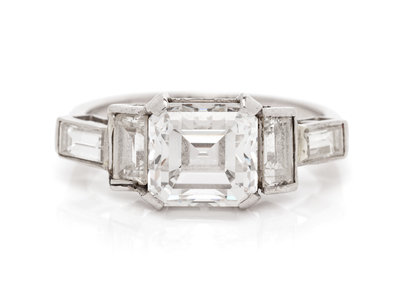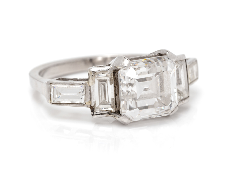 containing one octagonal step cut diamond weighing 3.60 carats and four baguette cut diamonds weighing approximately 1.00 carat total.