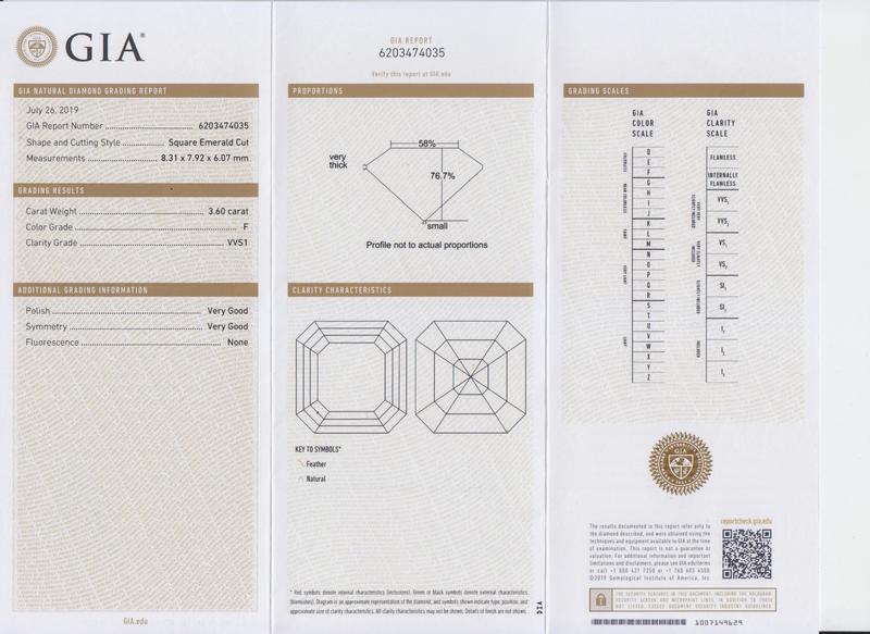 Accompanied by a Gemological Institute of America diamond grading certificate, number 6203474035, dated July 26, 2019, stating Color: F, Clarity: VVS1, Polish: Very Good, Symmetry: Very Good, Fluorescence: None.