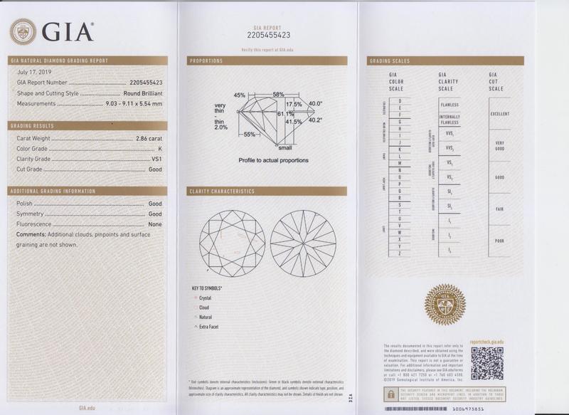 Accompanied by a Gemological Institute of America diamond grading certificate, number 2205455423, dated July 17, 2019, stating Color: K, Clarity: VS1, Cut Grade: Good, Polish: Good, Symmetry: Good, Fluorescence: None.