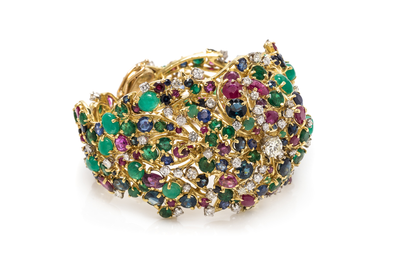 containing one round brilliant cut diamond weighing approximately 0.60 carat, numerous round brilliant cut diamonds weighing approximately 4.00 carats total and numerous round and oval shape mixed cut and cabochon cut emeralds, sapphires and rubies.