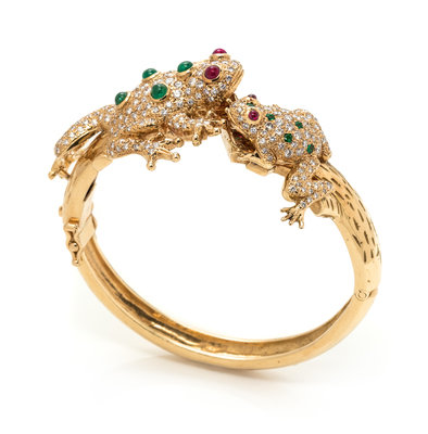 A Yellow Gold, Emerald, Ruby and Diamond Frog Bangle Bracelet,