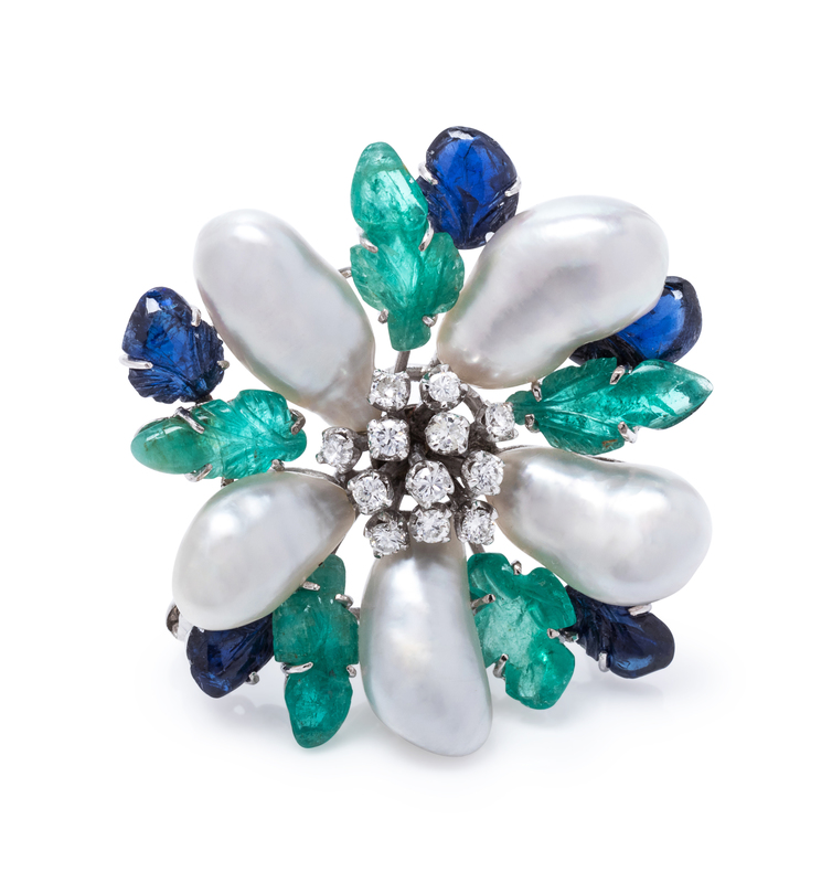 A 14 Karat White Gold, Diamond, Cultured Baroque Pearl, Emerald and Sapphire Brooch, Trio,