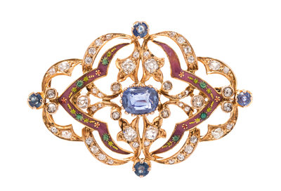 An Antique Yellow Gold, Sapphire, Diamond and Polychrome Enamel Brooch,