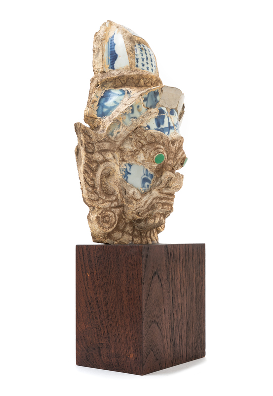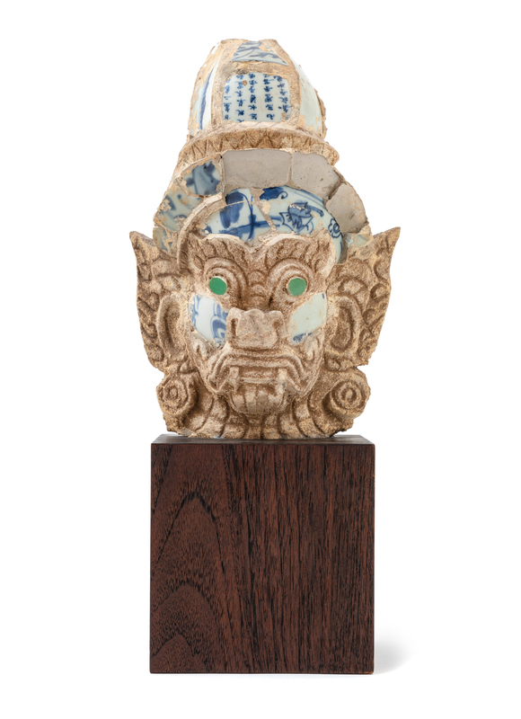 molded with a fierce facial expression, raised on a later stand.