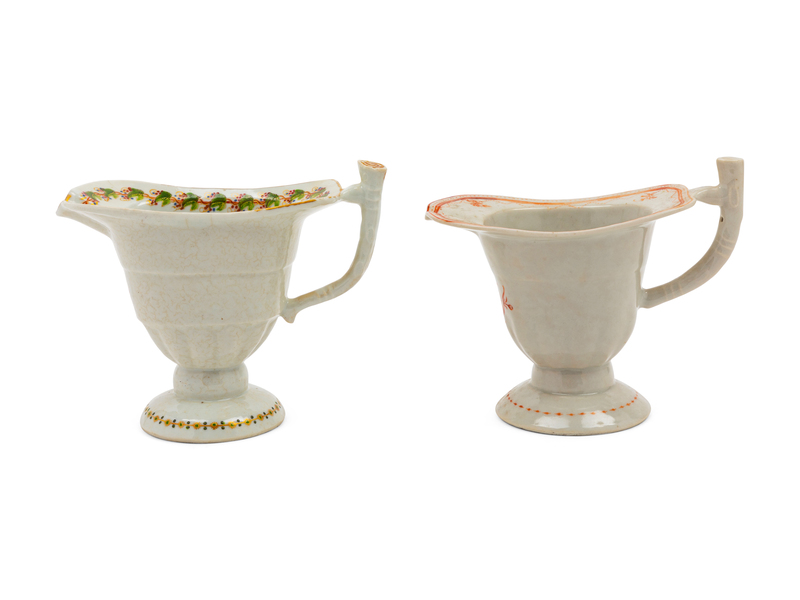 each of boat form with flaring handle, supported on a conforming pedestal foot with famille rose decoration bands.