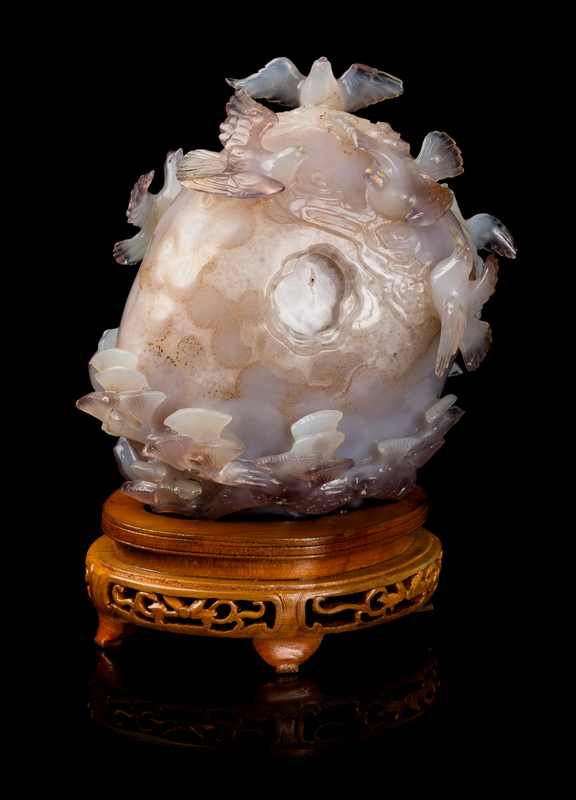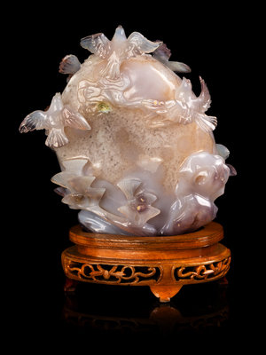 showing various birds enclosing a large oval rock, raised on a hardwood stand.