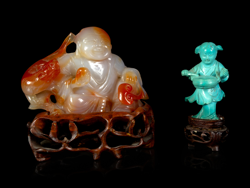 the first a carved agate figure of a laughing Buddha, the second a malachite figure of a drum boy, each raised on a fitted hardwood stand.
