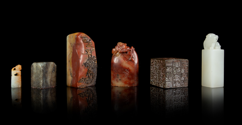 comprising a white jade rectangular example, carved with a fu lion-form finial; a russet and pale celadon jadeite example also with a fu lion-form finial; a black and grey soapstone seal; a russet hardstone oval form example carved with flowering prunus; a russet and pale celadon hardstone, carved depicting figures on a boat in a river next to tall rocky mountain; a set of five bronze examples.