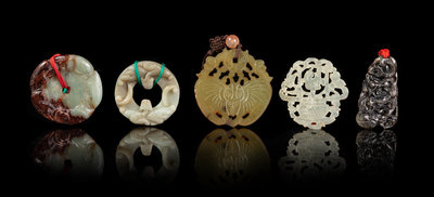 comprising two serpentine examples, one showing a winged bat underneath a coin, the other flower-filled basket; two celadon jade example, one in the form of a blossom, the other carved with chilongs; one black and celadon jadeite example carved to show a dragon amongst clouds.