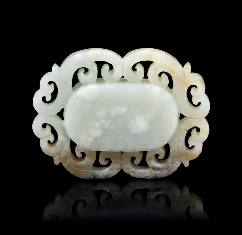 the plain center panel surrounded by a reticulated floral border, the stone is in pale celadon tone with grey inclusions.