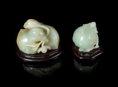 comprising a celadon and russet pair of ducks, and a pale group of boys and peach, each raised on a fitted hardwood stand.