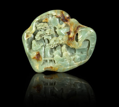 the irregular form stone of an even celadon tone with russet patches, carved to show a scholar underneath pine trees in a mountain grove.