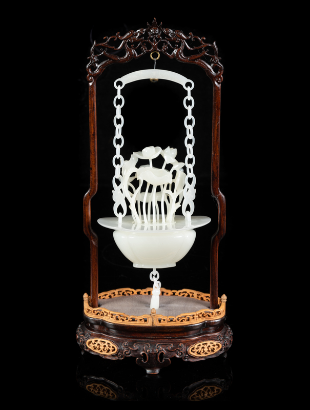 carved to show a basket filled with lotus, mounted on a hardwood stand.