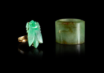 the first a green jadeite archer's ring, the second a yellow gold ring mounted with an apple green and celadon jadeite circada.
