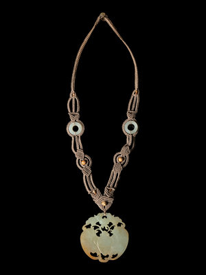the insect-form pendant suspended from braided drape of rope with beaded details.