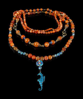 each comprising various rounded agate beads, one suspending blue enameled silver seahorse-form pendant.