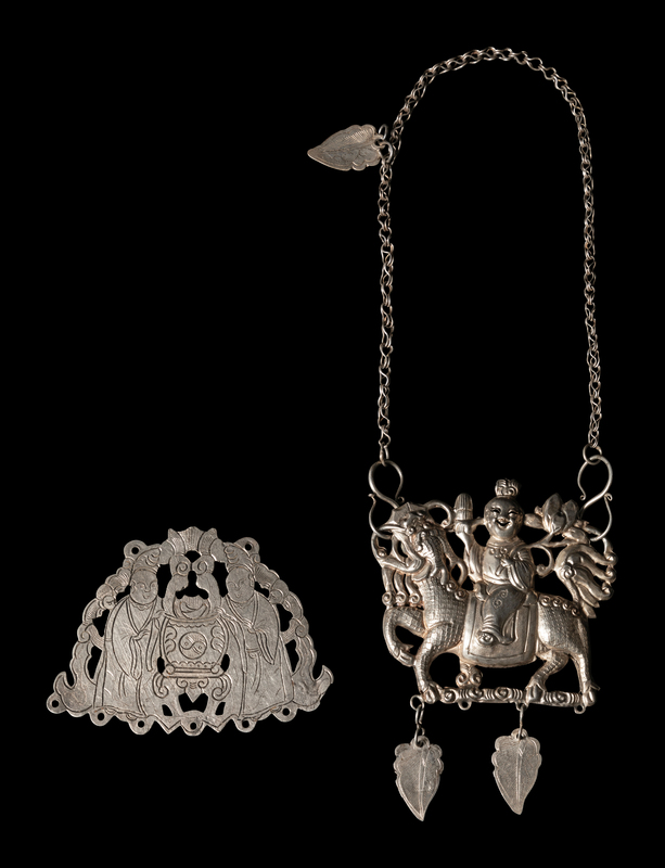 the first a silver necklace suspending a large pendant in the form of a boy riding a qilin, the second a silvered metal pendant incised with immortals.