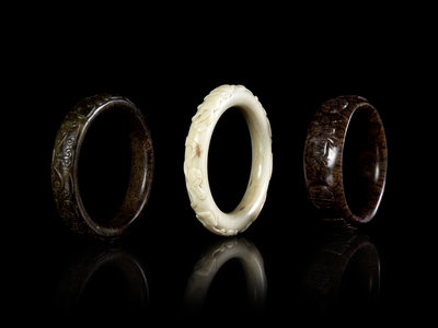 the white stone example carved with chilongs, two dark russet examples one carved with spiral motif, the other with characters.