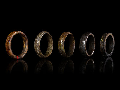 three carved with spiral decoration, one with animal figures, one with plain sides.