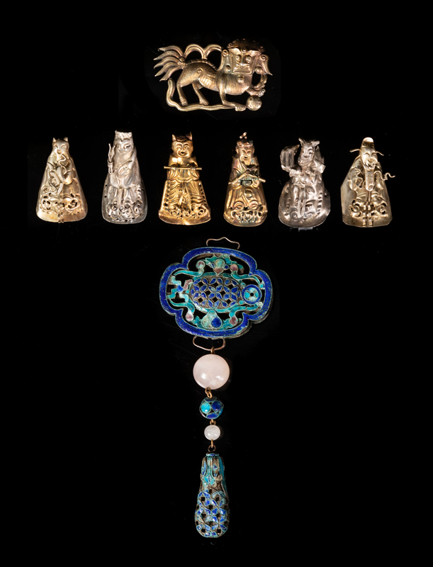 comprising an enameled on silver example with floral pattern, a silver fu lion-form example and six silver figural-form examples.