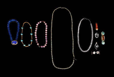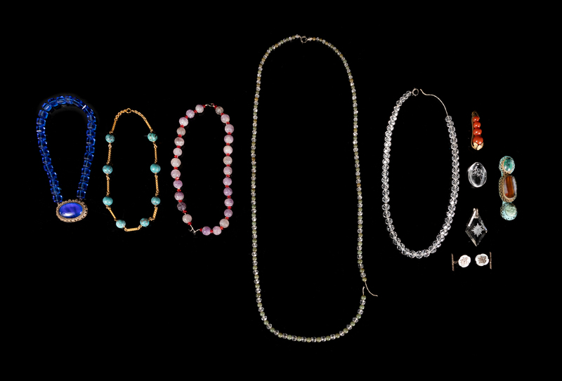 comprising fifteen hardstone and glass beaded necklaces, three loose hardstone and beaded necklaces, two hardstone inset metal belt buckles, one blue glass and gilt metal mounted hat finial, one orange glass and gilt metal mounted tie clip, three glass ear clips, a pair of mother-of-pearl and gilt metal cuff links and a pair of gilt metal cuff links.