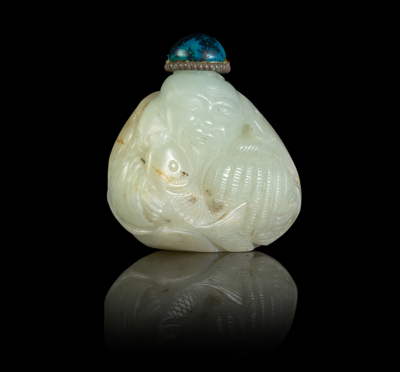 carved to depict a seated male figure holding a fish in the right hand and a bamboo basket in the left hand, blue hardstone stopper.