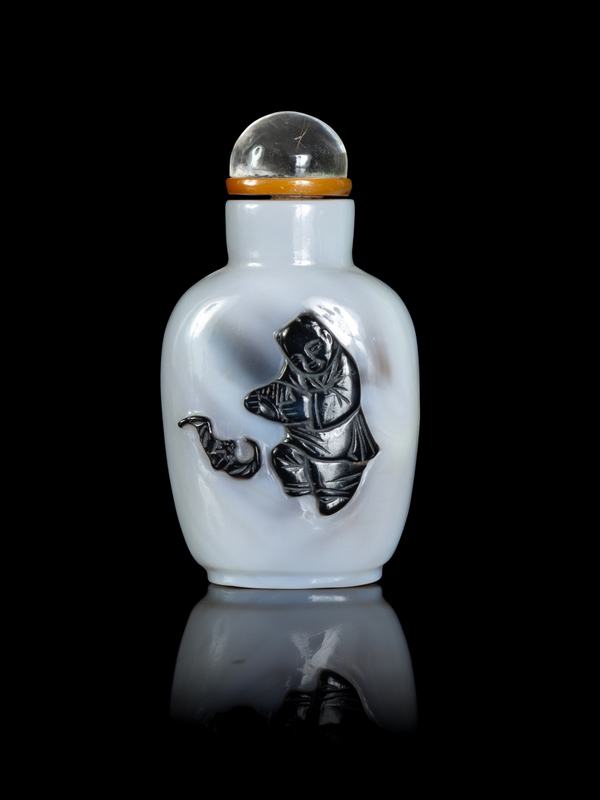 of ovoid form, carved to the front in relief depicting a child and a flying bat.