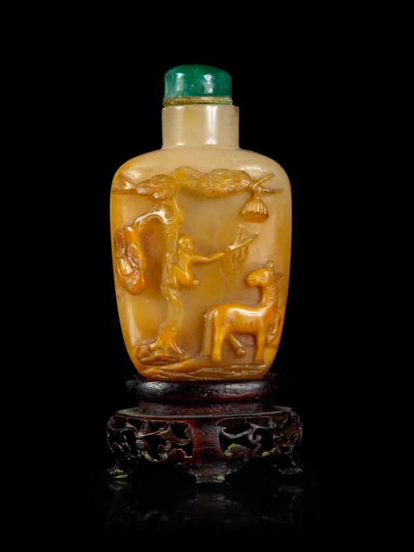carved in relief showing a donkey and monkey in a tree, raised on a fitted hardwood stand.