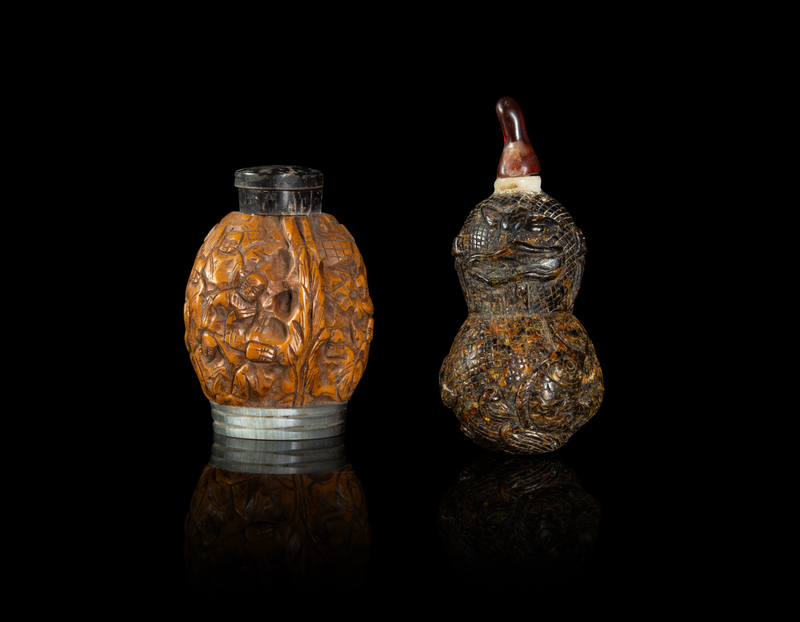 the first of naturalistic form, carved with various luohan figures, black plastic stopper; the second of gourd form, carved to show pavilions above fish in the sea, amber-tone plastic stopper.