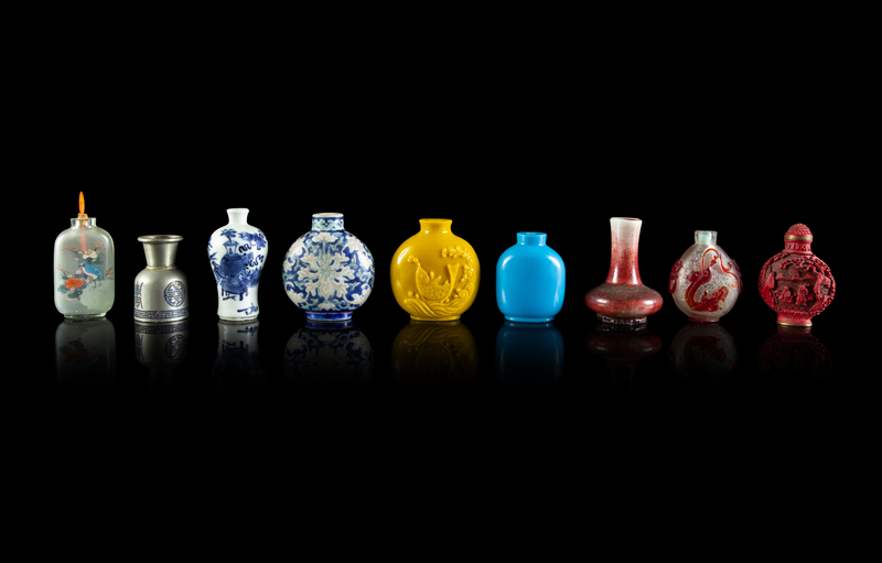 comprising one inside painted glass example, one silvered metal example, two blue and white porcelain examples, one yellow glass example, one blue glass example, one sang-de-boeuf example, one red overlay snowflake ground example and one cinnabar lacquer example.