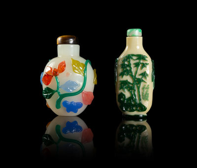 the first a multi-colored overlay white glass circular example, decorated with leafy branches, cat's eye stone stopper; the second a green overlay milky white glass rectangular form example, decorated with bamboo stalks, green jadeite stopper.