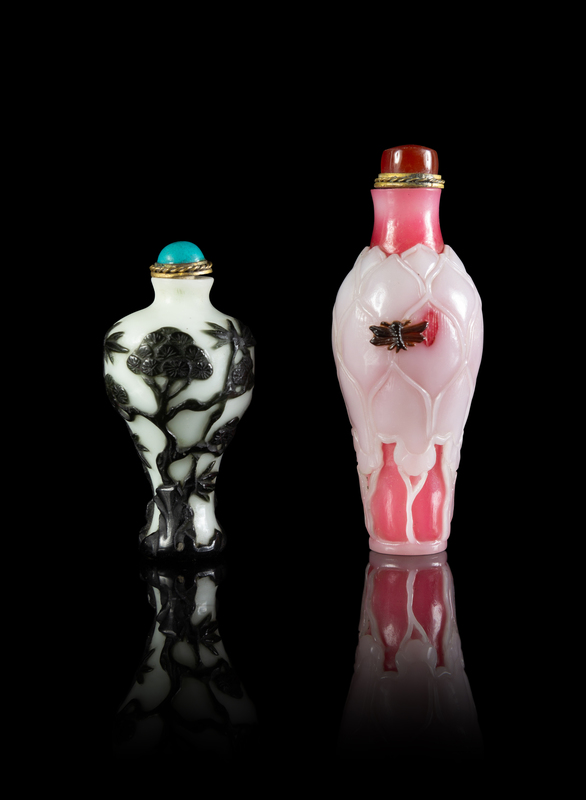 the first a white overlay pink glass example, molded with rows of lotus petals, the second a black overlay with white glass example, decorated with leafy trees.
