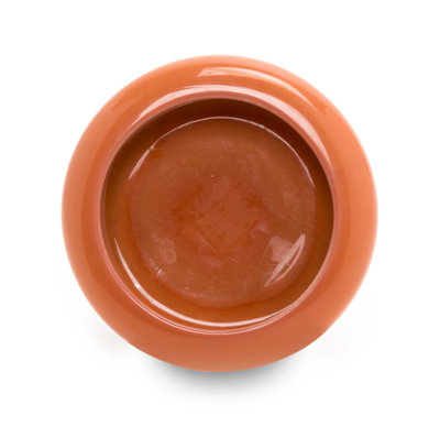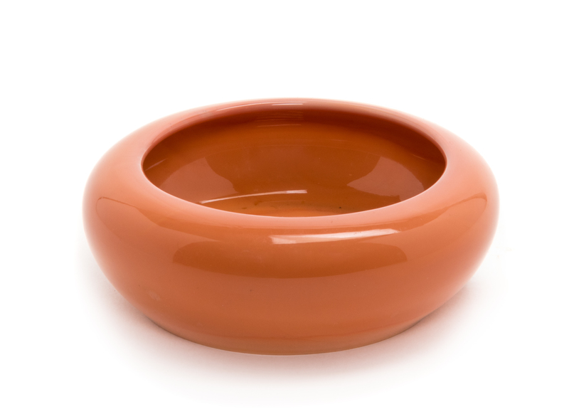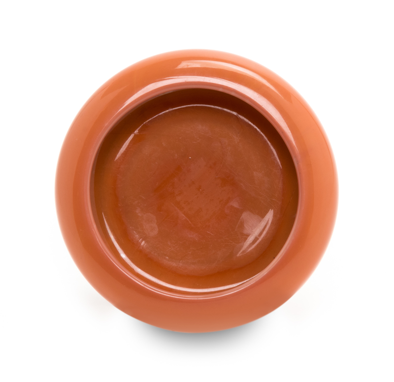 of compressed globular form with incurved, rounded sides, the swirling changes in color from pale yellow-orange across the base to dark orange to the interior.