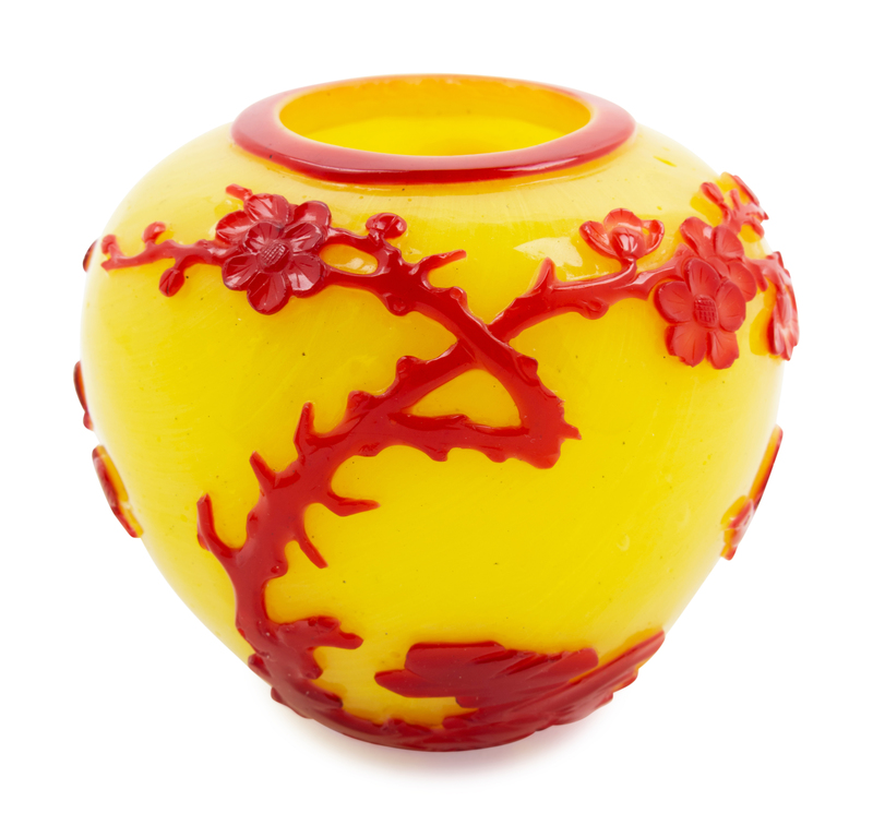 the round body of vibrant yellow glass, and rounded sides rising to high shoulders, with a red overlaid ring to the mouth rim and prunus branches to the body.